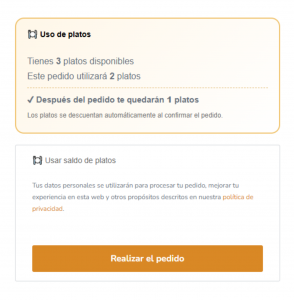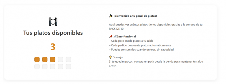 El saldo de platos es un sistema que te permite comprar platos por adelantado y utilizarlos más adelante en tus pedidos, sin tener que pagar cada vez con tarjeta. Además con el Pack de Platos el precio por unidad sale más económico.