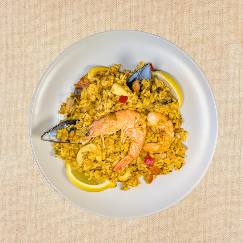 Arroz Redondo (40%), Pollo, Mezcla de Mariscos (anillas de calamar, mejillones, almeja del pacifico, gambas), cebolla, guisantes, pimiento rojo, pimiento verde, ajo, aceite de oliva virgen extra, caldo casero de pescado y marisco y pollo, sal, cúrcuma, pimienta negra.