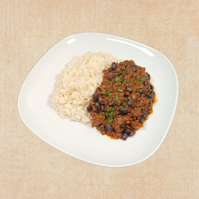 Carne picada de ternera (35%), alubias rojas, arroz vaporizado cocido (35%), tomate triturado (tomate, sal, acidulante: ácido cítrico), cebolla, pimiento rojo, ajo, comino, pimentón, chile, aceite de oliva virgen extra, sal, pimienta.