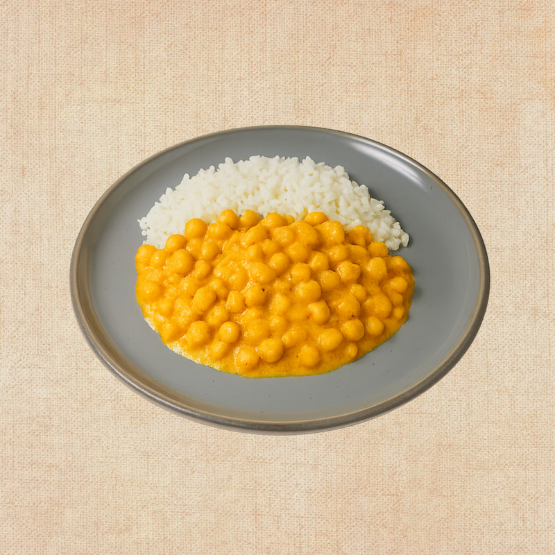 Garbanzos (35 %), arroz (45%), leche de coco, nata, cebolla, aceite de oliva virgen extra, pasta de curry rojo, ajo, ras el hanout, sal, pimienta negra.