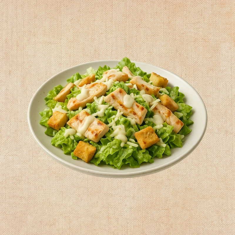 Mix de verdes, pechuga de pollo, tomate cherry, pepino, queso parmesano (leche), picatostes (pan de trigo), aderezo César (huevo, aceite de girasol, anchoa, mostaza, zumo de limón, queso parmesano, vinagre de vino (sulfitos), salsa inglesa (vinagre de malta (cebada), vinagre de alcohol, melaza, azúcar, sal, anchoas (pescado), cebolla, ajo, especias, aromas)).
