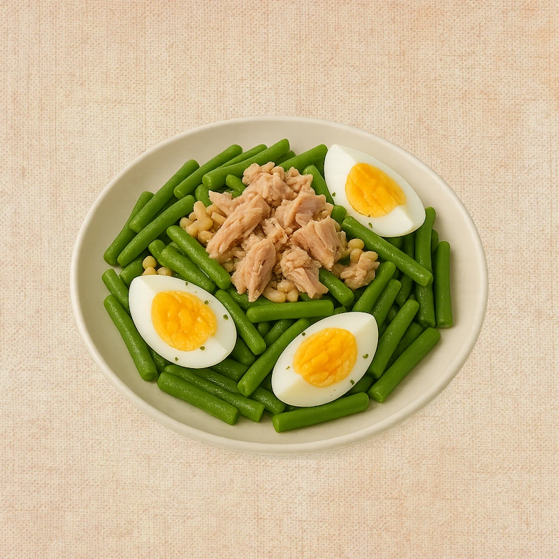 Judías verdes (40%), atún en conserva al natural (20%) (atún, agua, sal), huevo (20%), tomate, cebolla morada, aceite de oliva virgen extra, vinagre de vino (contiene sulfitos), sal, pimienta.