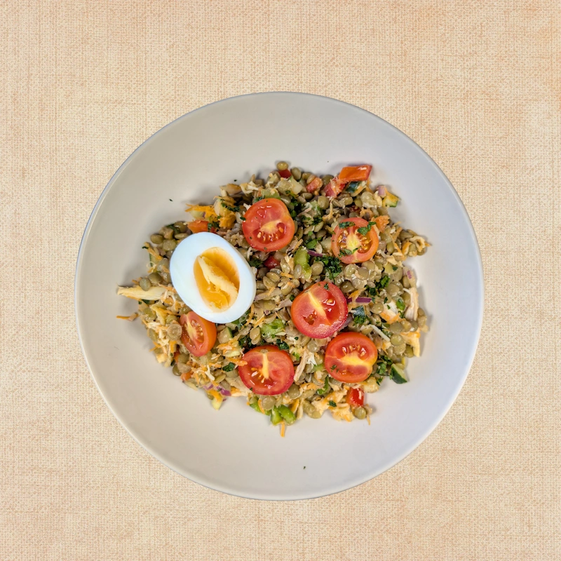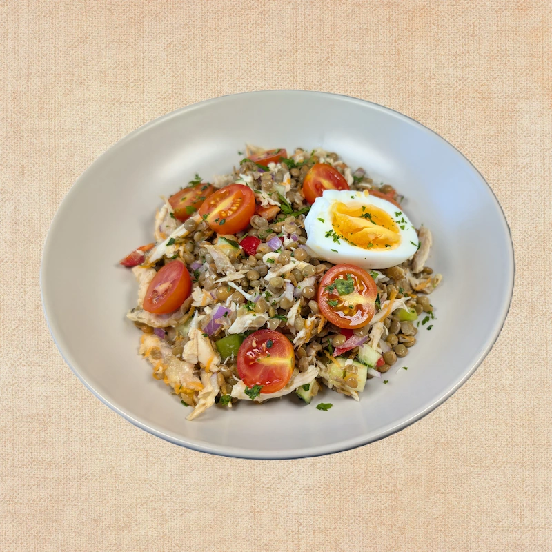 Lentejas cocidas (40%), pechuga de pollo (20%), tomate cherry, cebolla morada, zanahoria, pimiento rojo, pimiento verde, pepino, huevo cocido, aceite de oliva virgen extra, vinagre de vino (contiene sulfitos), sal, pimienta, perejil.