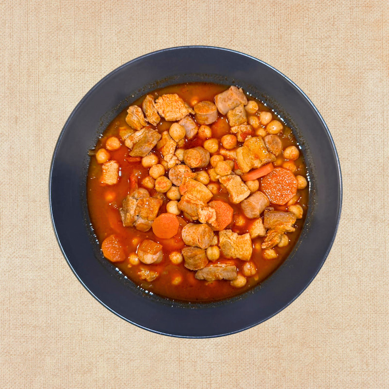 Garbanzos (30%), chorizo criollo (Carne de cerdo 54%, carne de vacuno 36%, agua, sal, dextrosa, almidón de maíz, especias, fibra vegetal (guisante), antioxidantes (E-331, E-300), conservador E-221 (sulfitos), aromas. Tripa natural de cerdo), chorizo asturiano (carne y tocino de cerdo, pimenton, sal y ajo), panceta de cerdo, patata, panceta oreada, tocino, zanahoria, cebolla, pimiento rojo, aceite de oliva virgen extra, ajo, caldo de carne, sal, pimienta negra.