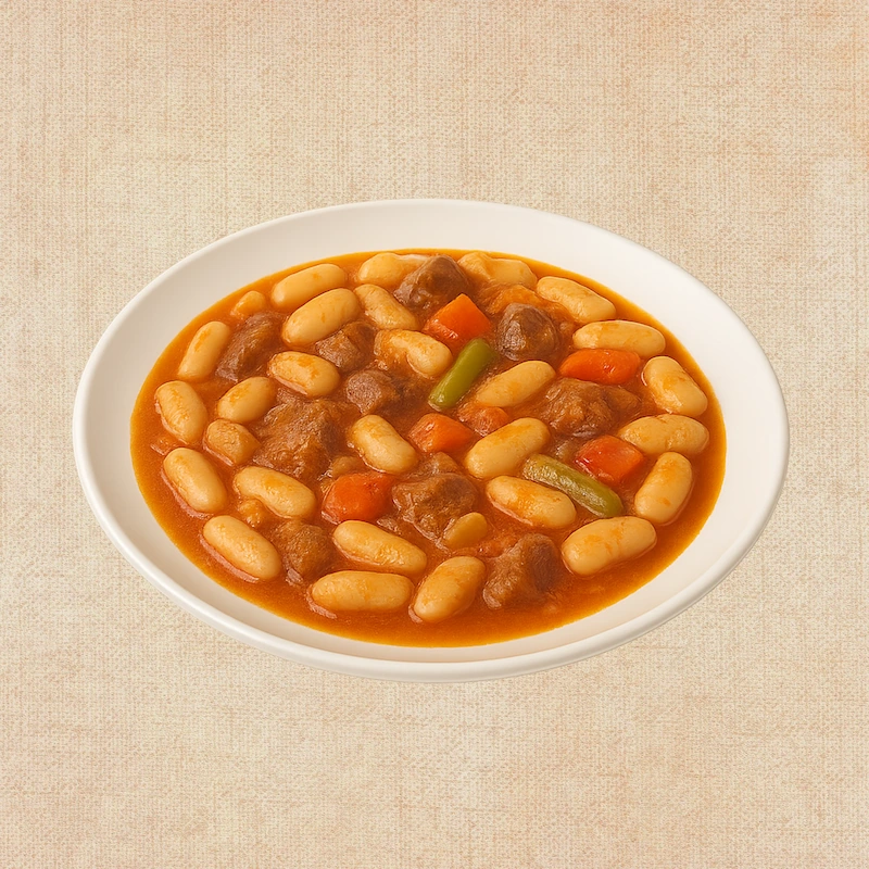 Judias blancas (30%), chorizo criollo (carne de cerdo 54%, carne de vacuno 36%, agua, sal, dextrosa, almidón de maíz, especias, fibra vegetal (guisante), antioxidantes (E-331, E-300), conservador E-221 (sulfitos), aromas. Tripa natural de cerdo), chorizo asturiano (carne y tocino de cerdo, pimenton, sal y ajo), panceta de cerdo, patata, panceta oreada, tocino, zanahoria, cebolla, pimiento rojo, aceite de oliva virgen extra, ajo, caldo de carne, sal, pimienta negra.