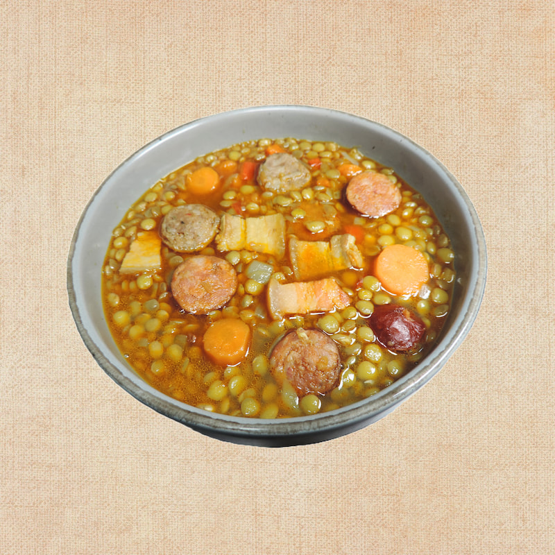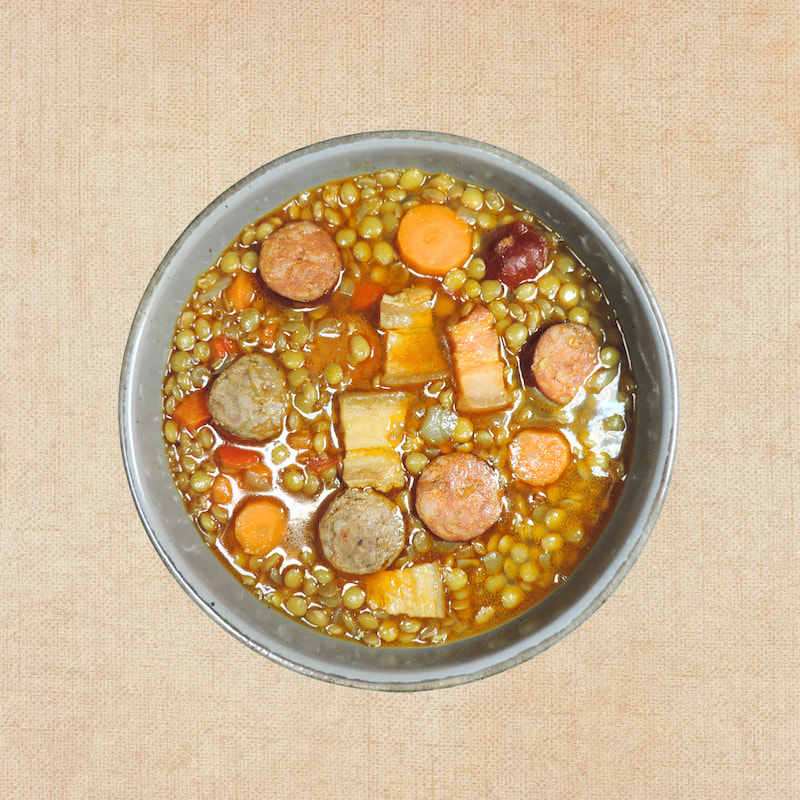 Lentejas (30%), chorizo criollo (carne de cerdo 54%, carne de vacuno 36%, agua, sal, dextrosa, almidón de maíz, especias, fibra vegetal (guisante), antioxidantes (E-331, E-300), conservador E-221 (sulfitos), aromas. Tripa natural de cerdo), chorizo asturiano (carne y tocino de cerdo, pimenton, sal y ajo), patata, panceta de cerdo, panceta oreada (panceta de cerdo, sal, antioxidante (E-301) y conservador (E-250)), tocino, zanahoria, cebolla, pimiento rojo, aceite de oliva virgen extra, ajo, caldo de carne, sal, pimienta negra.