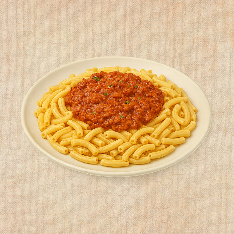 Macarrones (50%) (sémola de trigo duro), Boloñesa (50%) (tomate triturado (tomate, sal, acidulante: ácido cítrico), carne picada de ternera, agua, cebolla, pimiento rojo, pimiento verde, zanahoria, apio, concentrado de tomate, aceite de oliva virgen extra, sal, pimienta, pimentón, orégano, laurel, comino, ají molido).