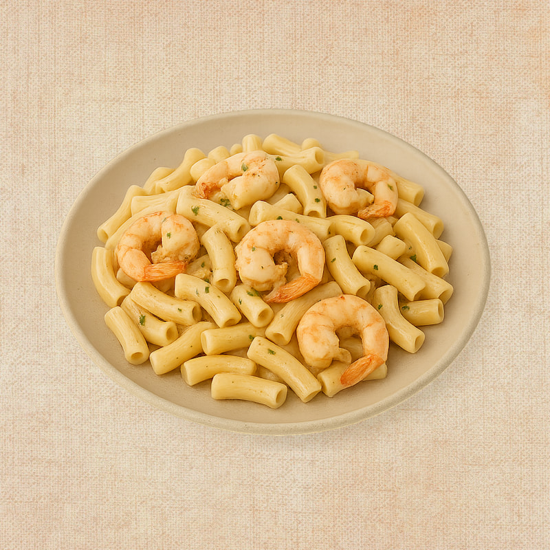 Macarrones (60%) (sémola de trigo duro), Gambas al Ajillo (40%) (gambas peladas (crustáceos y sulfitos), aceite de oliva virgen extra, ajo, guindilla, sal, pimienta negra, perejil fresco.)