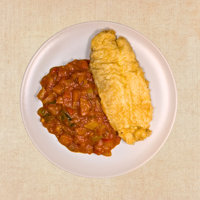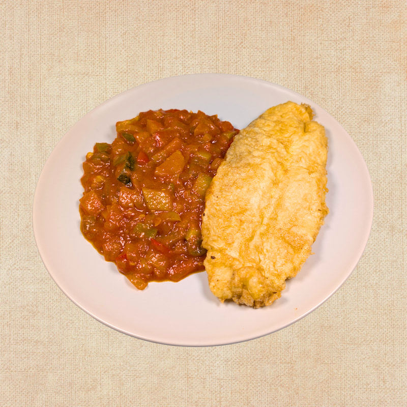 Pescado rebozado con Pisto de Verduras