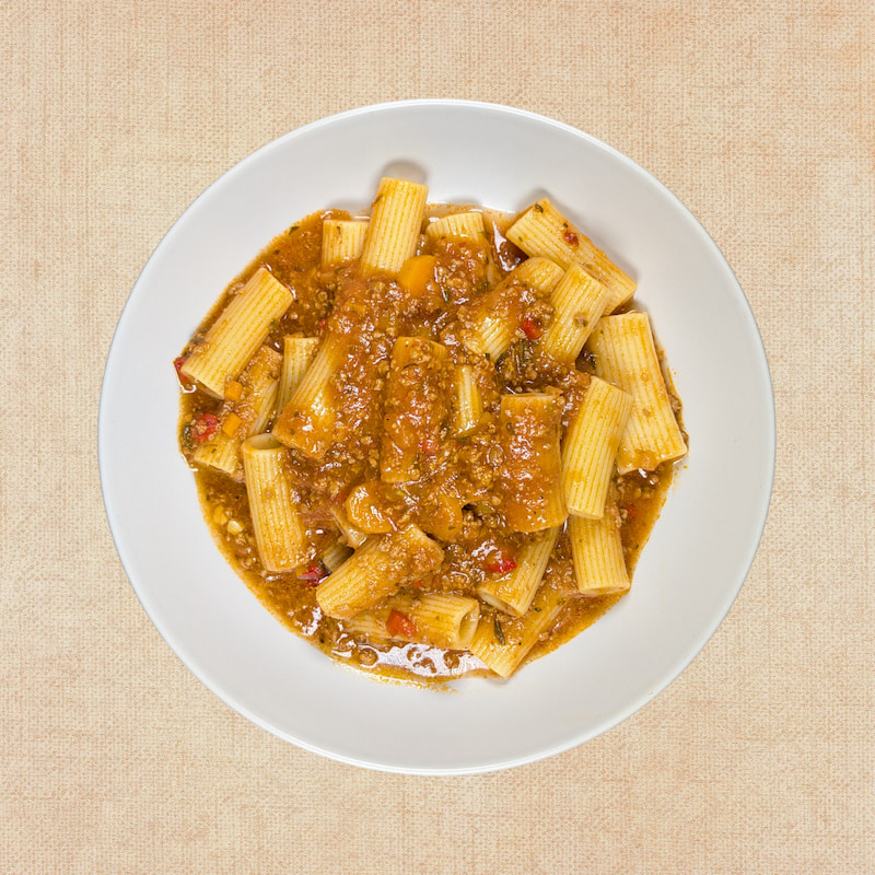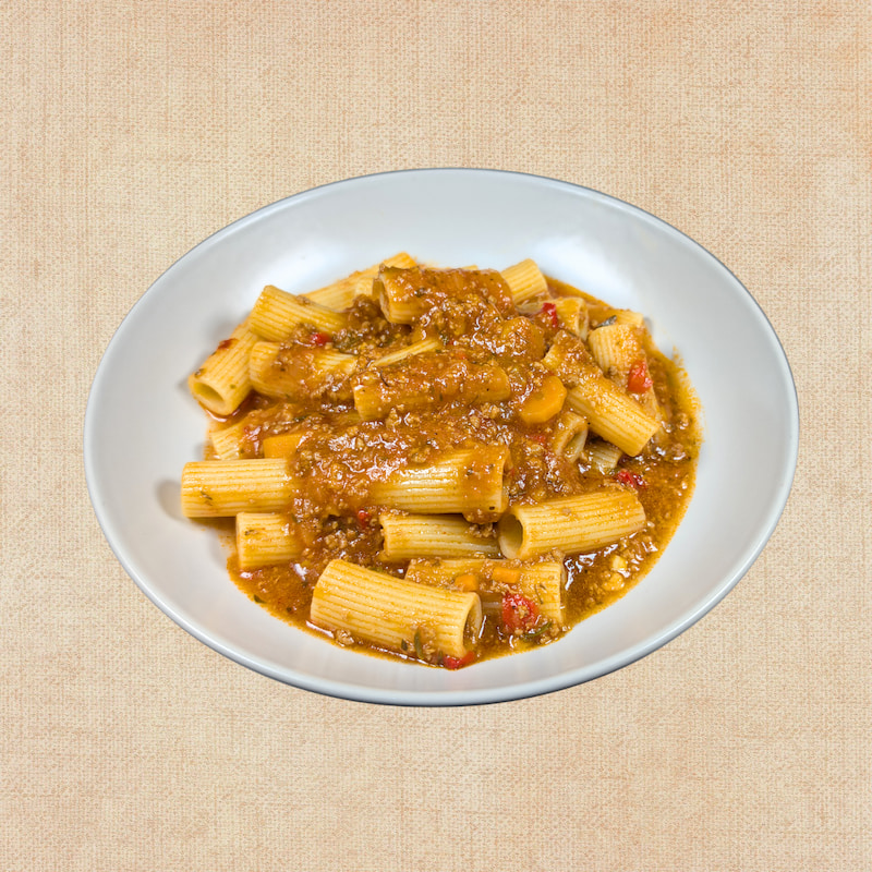 Rigatoni (50%) (sémola de trigo duro), Boloñesa (50%) (tomate triturado (tomate, sal, acidulante: ácido cítrico), carne picada de ternera, agua, cebolla, pimiento rojo, pimiento verde, zanahoria, apio, concentrado de tomate, aceite de oliva virgen extra, sal, pimienta, pimentón, orégano, laurel, comino, ají molido).