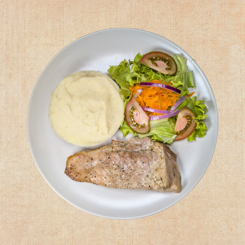 Secreto de cerdo (35 %), puré de patata (patata, leche pasteurizada, mantequilla, sal, nuez moscada, pimienta negra). Ensalada: mezcla de hojas verdes, tomate cherry, zanahoria, cebolla morada.