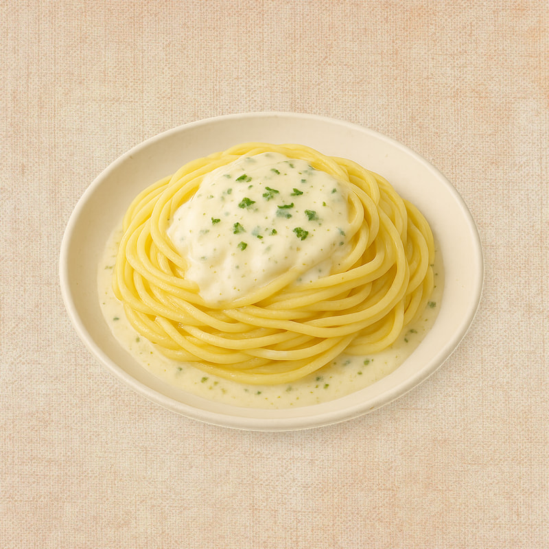 Spaghetti (50%) (sémola de trigo duro), Salsa 4 Quesos (50%) (mezcla de quesos (azul, emmental, grana padano, arzua), nata (nata ligera, almidón modificado de maíz, emulgente (E-471) y estabilizantes (E-415, E-451, E-460 y E-466), leche, mantequilla, sal, pimienta negra].