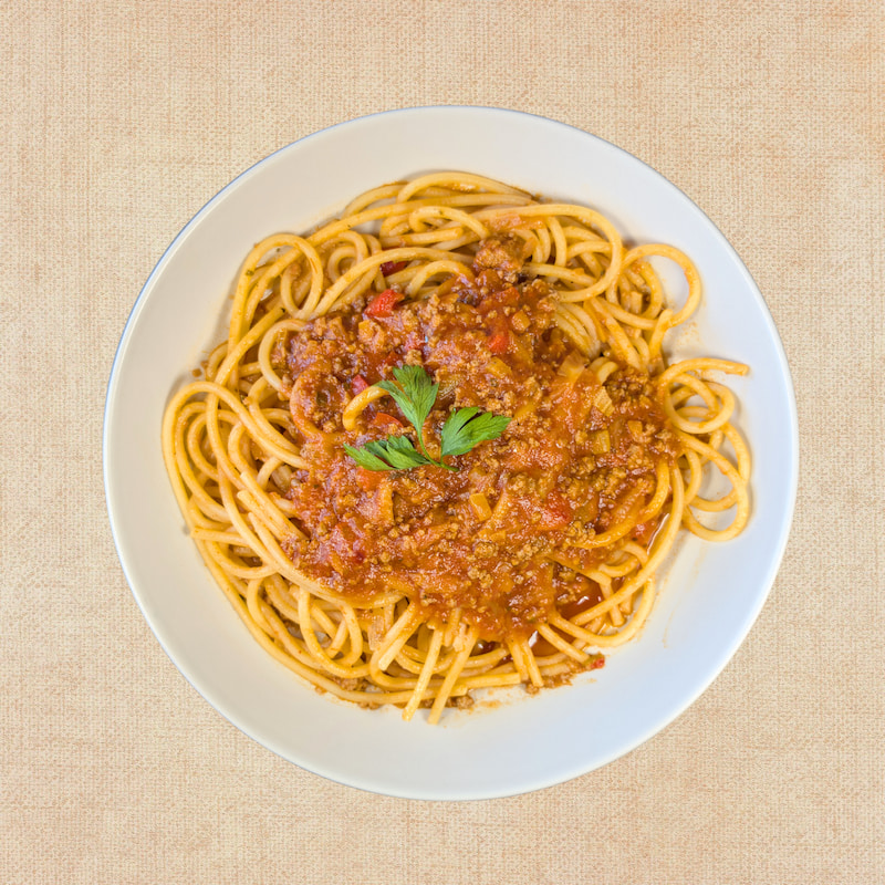 Tagliatelle (50%) (sémola de trigo duro), Boloñesa (50%) (tomate triturado (tomate, sal, acidulante: ácido cítrico), carne picada de ternera, agua, cebolla, pimiento rojo, pimiento verde, zanahoria, apio, concentrado de tomate, aceite de oliva virgen extra, sal, pimienta, pimentón, orégano, laurel, comino, ají molido).