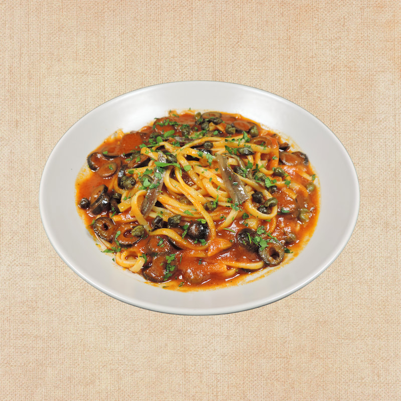 Tagliatelle (50%) (sémola de trigo duro), Salsa Putanesca (50%) (tomate triturado (tomate, sal, acidulante: ácido cítrico), agua, aceitunas negras, alcaparras (alcaparras, agua, vinagre de vino (contiene sulfitos), sal), anchoa (anchoa, aceite de girasol, sal), aceite de oliva virgen extra, guindilla, sal, ajo).