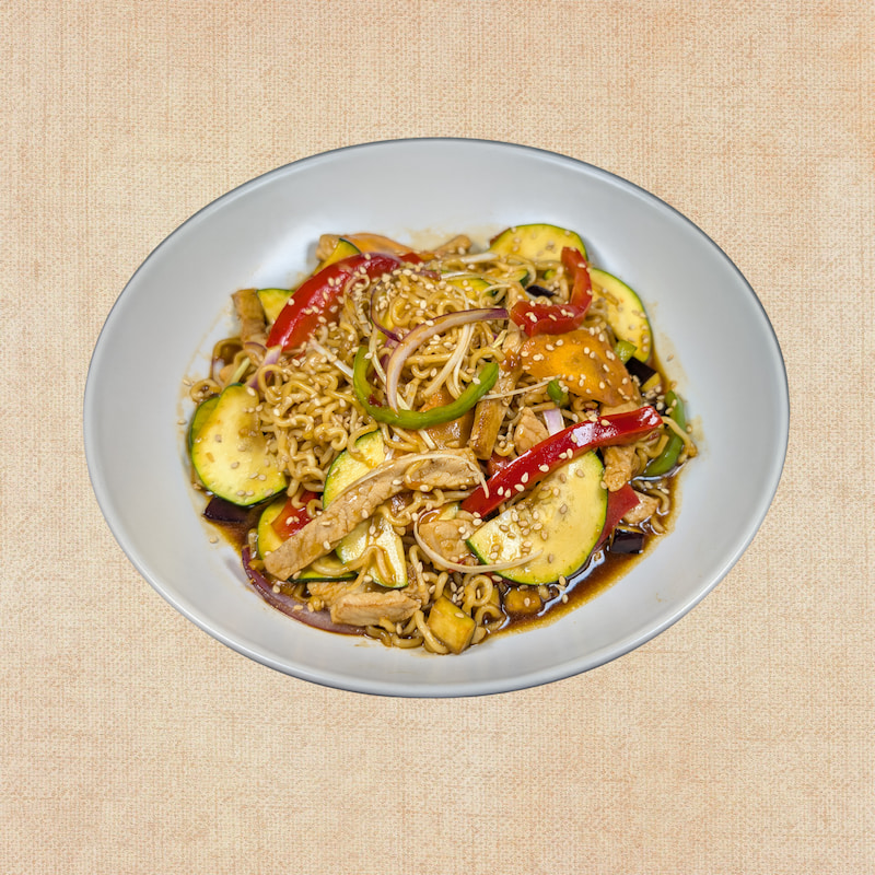 Fideos instantáneos (harina de trigo, aceite de girasol, fécula de patata, sal, gasificantes: carbonatos de sodio y potasio), lomo de cerdo, calabacín, cebolla morada, pimiento rojo, pimiento verde, zanahoria, berenjena, puerro, salsa de soja, salsa sweet chili, aceite de oliva virgen, salsa Valentina, ajo, miel, zumo de lima, sésamo.