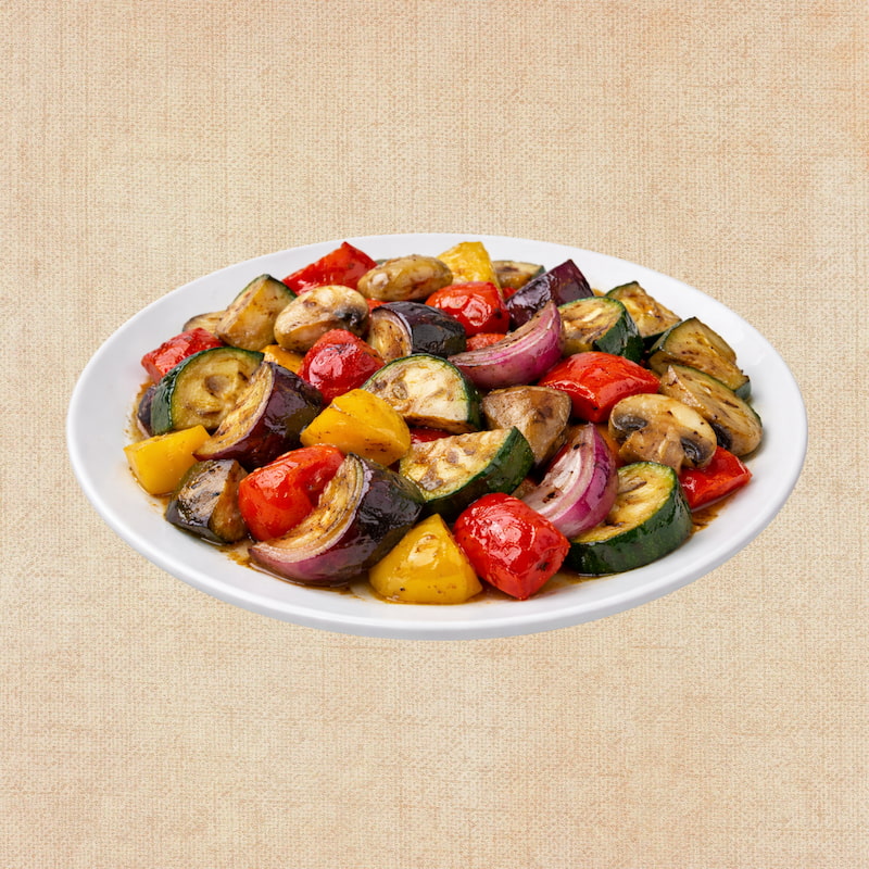 Patata (20%), calabaza (20%), calabacín (15%), berenjena (15%), pimiento rojo (10%), pimiento verde (10%), cebolla morada (10%), aceite de oliva virgen extra, sal, pimienta, tomillo.